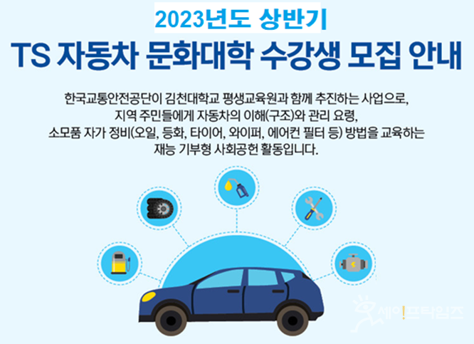 공단은 다음달 10일부터 4주간 김천대 평생교육원에서 '2023년 상반기 TS 자동차 문화대학'을 운영해 자동차 관리와 자가 정비방법 등을 교육한다고 11일 밝혔다.