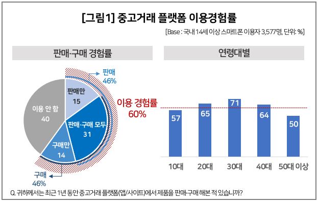 데이터융복합·소비자리서치 전문기관 컨슈머인사이트는 14세 이상 휴대폰 이용자 3577명을 대상으로 중고거래 플랫폼 이용 경험을 조사한 결과 지난해 하반기 기준 중고거래 플랫폼 이용률은 60%였다고 23일 밝혔다.