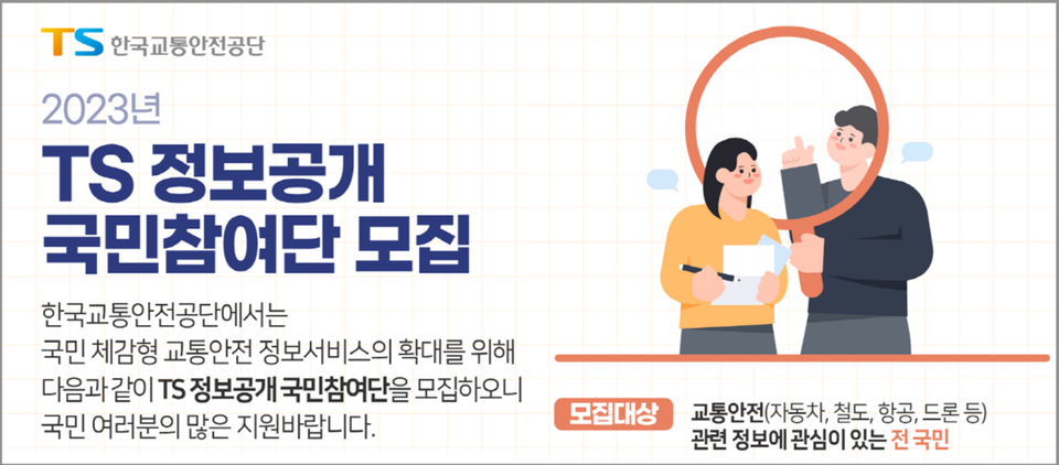 한국교통안전공단(TS)은 '2023 TS 정보공개 국민참여단'을 모집한다고 27일 밝혔다.