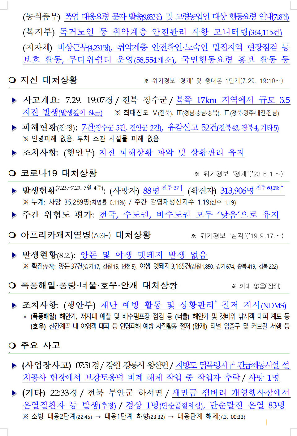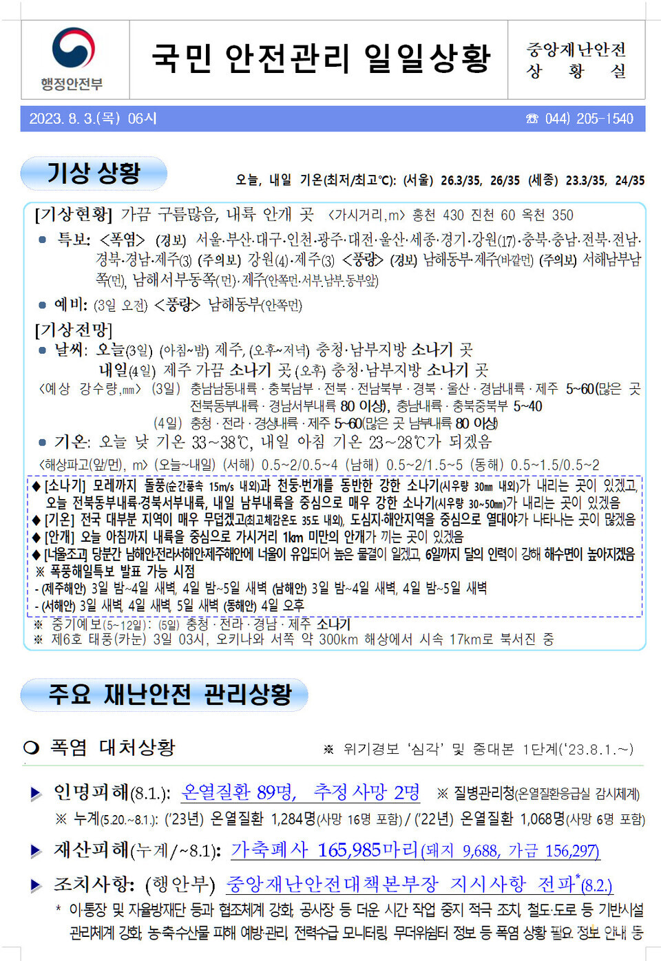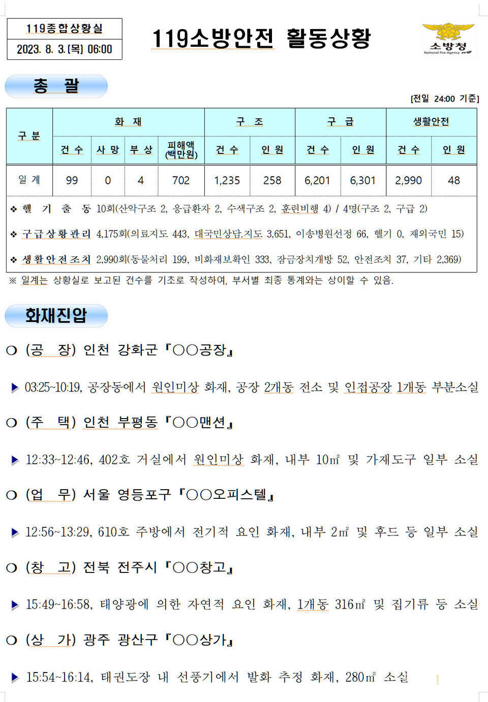 2023년 8월 3일 ▲ 전북소방본부(본부장 주낙동)는 새만금 세계잼버리 기간동안 공연과 체험활동장에서 온열질환자뿐만 아니라 벌레물림, 설사, 열상 등 환자가 발생하고 있어 백제허브, 신라허브, 고려허브, 조선허브, 고구려허브 등 방면에 구급차와 소방차를 배치하여 신속하게 대응하고 있다. ⓒ 전북소방본부 김도수 기자 hl5jem1952@safetimes.co.kr 다른기사 보기 저작권자 © 누구나 안심하고 살 수 있는 세상을 만드는 언론 세이프타임즈 무단전재 및 재배포 금지 관련기사 폭염 속 '생존게임' … 걱정거리된 '새만금 잼버리' 광주교육청, 교육부와 잼버리 참가자에게 숙소 제공 협의 좋아요6훈훈해요0슬퍼요0화나요0후속기사 원해요0 개의 댓글 회원로그인 작성자 비밀번호 댓글 내용입력 댓글 정렬 최신순 추천순 답글순 BEST댓글 BEST 댓글 답글과 추천수를 합산하여 자동으로 노출됩니다. 닫기 더보기 댓글삭제 삭제한 댓글은 다시 복구할 수 없습니다. 그래도 삭제하시겠습니까? 비밀번호 닫기 댓글수정 댓글 수정은 작성 후 1분내에만 가능합니다. 본문 / 400 비밀번호 닫기 내 댓글 모음 닫기