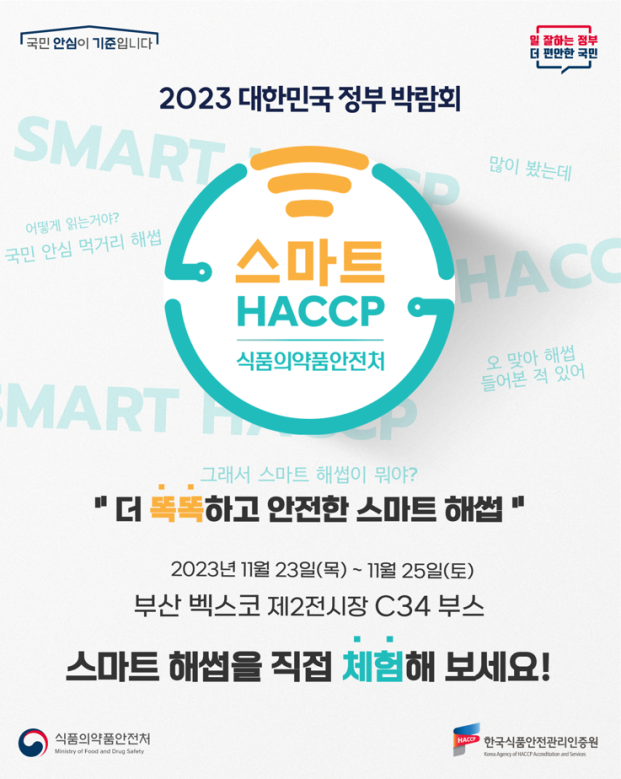 식품의약품안전처는 한국식품안전관리(HACCP)인증원과 '2023 대한민국 정부 박람회'에 참가해 스마트 해썹 홍보관을 운영한다고 23일 밝혔다.