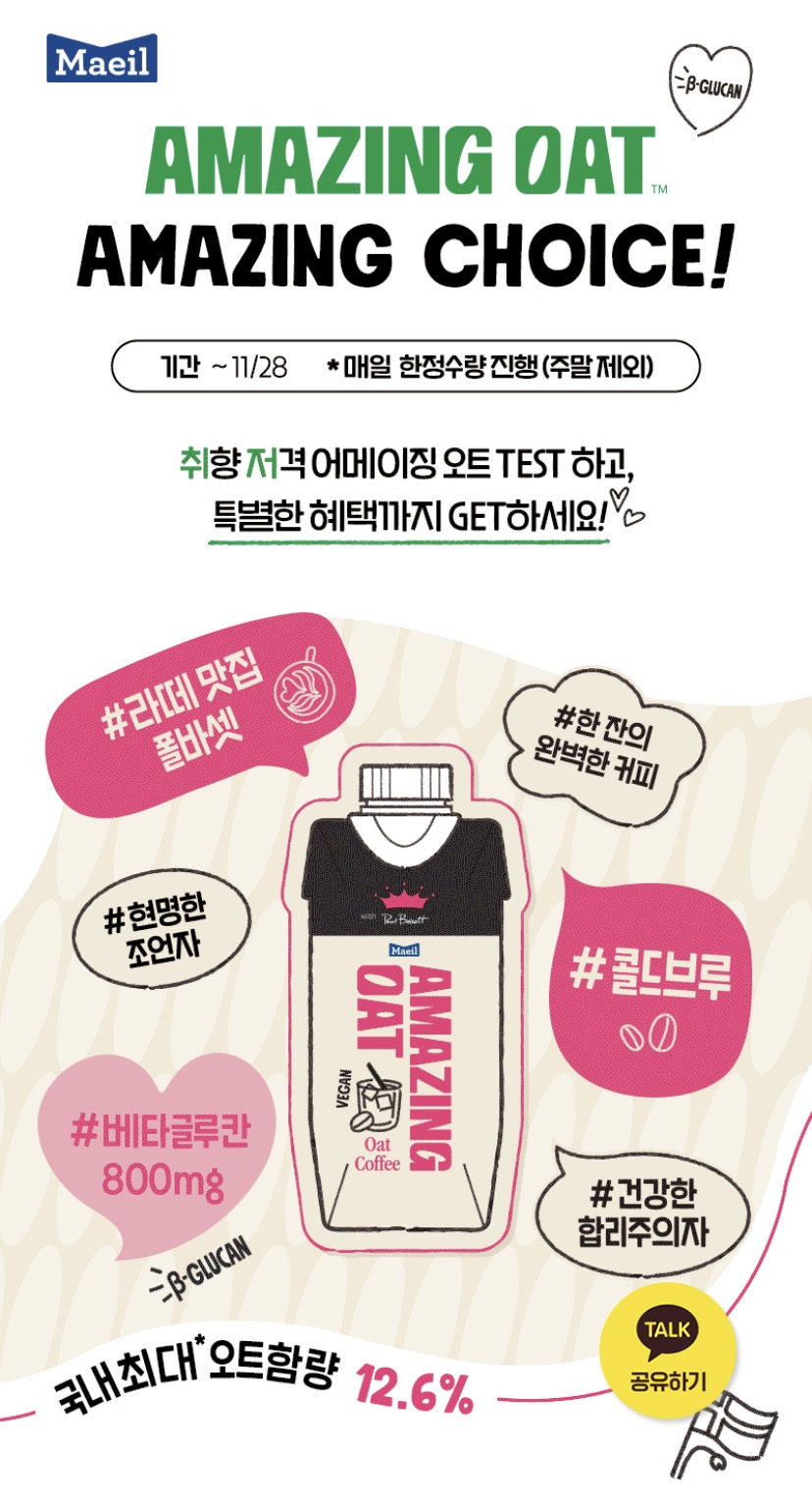 매일유업은 '어메이징 오트 원픽' 이벤트를 계획하고 있다. 다음달 15일까지 어메이징 오트 5중 가운데 가장 선호하는 제품을 필수 해시태그를 입력해 개인 SNS에 후기를 올리면 추첨을 통해 경품이 제공된다.