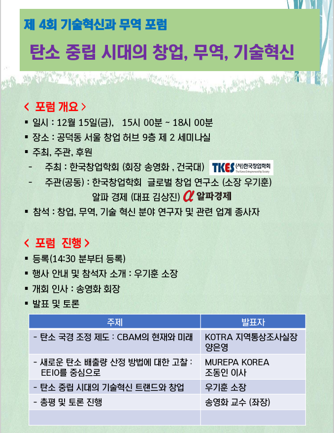 탄소중립시대 창업과 무역, 기술혁신에 대한 폭넓은 논의가 이뤄질 학술 포럼이 열린다.