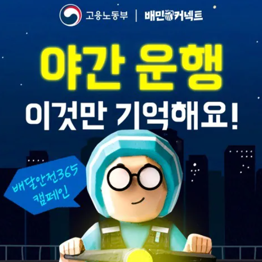 첫 캠페인 주제는 '야간운행 안전수칙'으로 야간 운행 시 △안전장비 착용 △저속 운행 △사각지점 꼼꼼히 살피기 등을 카드뉴스로 제작해 배민 중개 앱에 지난달부터 안내되고 있으며 이번달부터 노동부 SNS 등에도 게시될 예정이다.