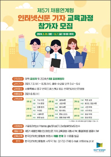 채용연계 교육은 대학 졸업자 또는 오는 8월 졸업예정자가 지원할 수 있으며 인터넷신문협회 회원사 대표 추천 특별전형은 입사 6개월 미만이면 가능하다.