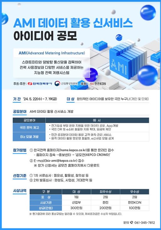 한국전력은 산업통상자원부가 주관하고 한전KDN이 후원하는 대국민 AMI 데이터 활용 신서비스 아이디어 공모를 진행한다고 22일 밝혔다.