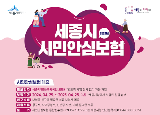 시민안심보험은 세종시에 주민등록을 두고 있는 시민이라면 자동으로 보험에 가입되며 보험료는 시에서 부담한다. 가입 기간 중 발생한 사고는 3년 이내로 보험사에 청구해야 하며 자세한 문의는 시민안심보험 통합접수센터(☎1522-3556)로 하면 된다.