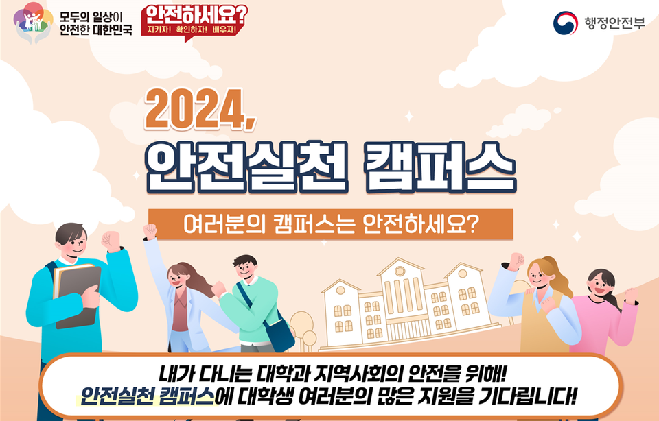 행정안전부는 10일부터 대학생을 대상으로 '2024 안전실천 캠퍼스' 지원팀을 모집한다.