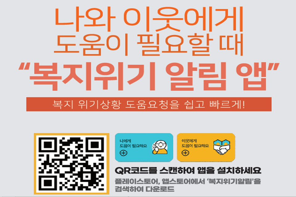 복지위기 알림 앱은 이웃이 경제적 어려움, 건강 문제, 고립·고독 등 복지 위기 상황을 휴대폰을 통해 신속하게 알릴 수 있도록 개발한 앱(APP)으로 디지털플랫폼정부위원회의 '국민체감 선도프로젝트' 과제로 선정돼 추진한 사업이다.