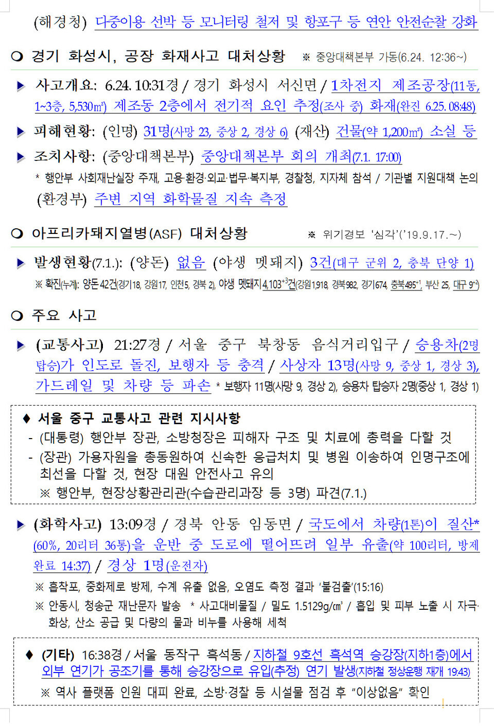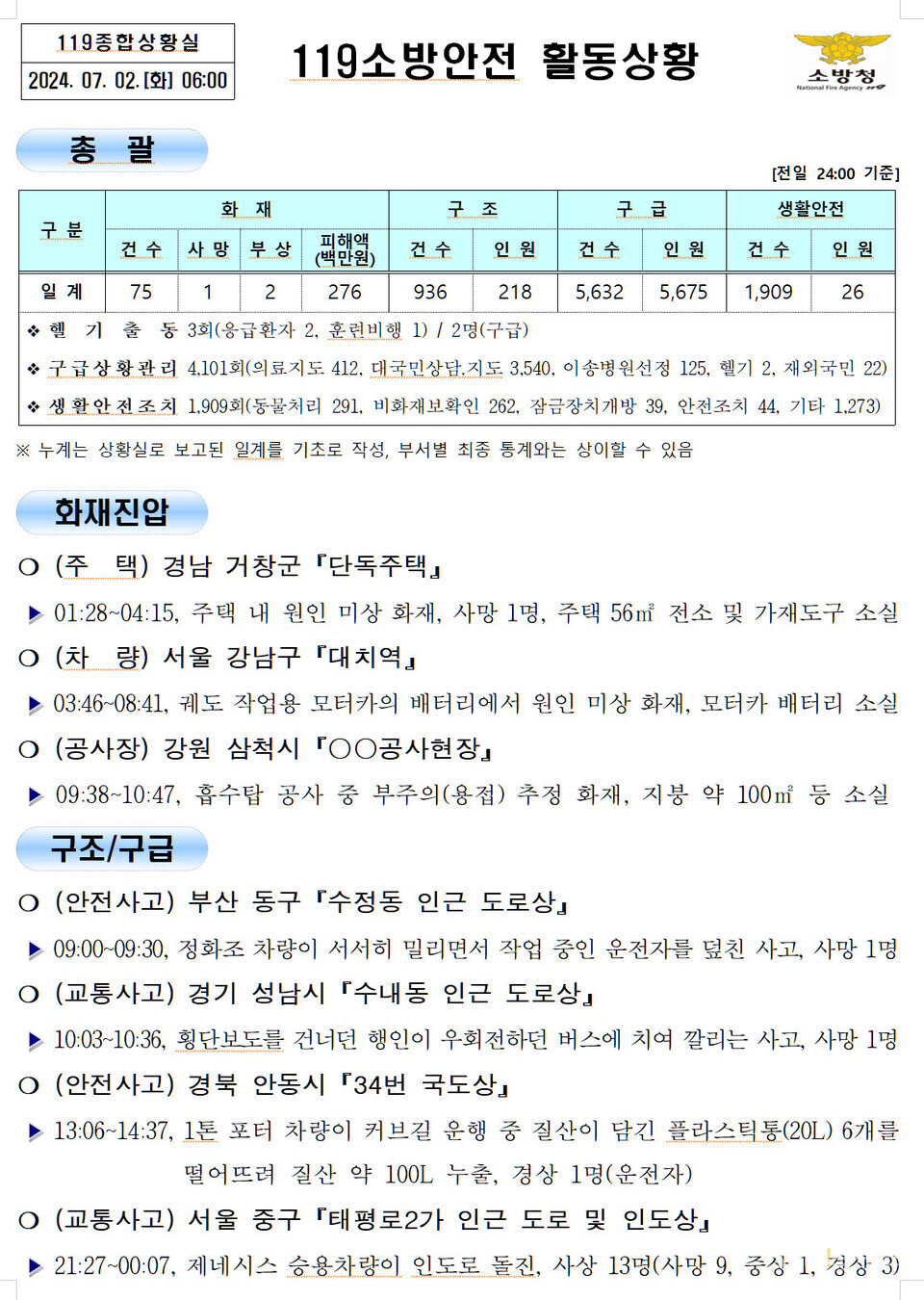 2024년 7월 2일 ▲ 김조일 부산소방본부장은 순직 소방인의 헌신과 위훈을 기리기 위해 1일 오전 119안전체험관 내에 있는 119기념공원을 참배하고 별도의 취임행사 없이 오후에는 화재 및 자연재난 위험지역 현장점검으로 취임 첫 공식 업무를 시작했다. ⓒ 부산소방본부 김도수 기자 hl5jem1952@safetimes.co.kr 다른기사 보기 저작권자 © 누구나 안심하고 살 수 있는 세상을 만드는 언론 세이프타임즈 무단전재 및 재배포 금지 관련기사 13명 사상자 낸 시청역 역주행 사고 … 운전자는 '급발진' 주장 180m 역주행해 11명 덮친 제네시스 … '1초'만에 갈린 운명 시청역 역주행 차량이 불러온 '참사' … 인도에서 벌어진 교통사고 '시청역 참사' 수사 본격화 … 피의자 '급발진' vs 경찰 '조사' 시청역 역주행 참사 운전자 구속 기소 좋아요2훈훈해요0슬퍼요1화나요0후속기사 원해요0 개의 댓글 회원로그인 작성자 비밀번호 댓글 내용입력 댓글 정렬 최신순 추천순 답글순 BEST댓글 BEST 댓글 답글과 추천수를 합산하여 자동으로 노출됩니다. 닫기 더보기 댓글삭제 삭제한 댓글은 다시 복구할 수 없습니다. 그래도 삭제하시겠습니까? 비밀번호 닫기 댓글수정 댓글 수정은 작성 후 1분내에만 가능합니다. 본문 / 400 비밀번호 닫기 내 댓글 모음 닫기