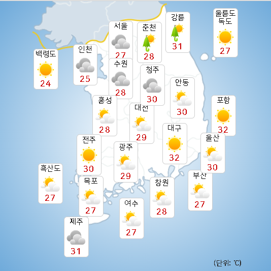 아침 최저기온은 22∼26도, 낮 최고기온은 25∼32도로 예보됐다.