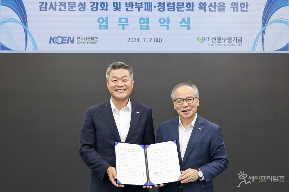 신용보증기금은 2일 경남 창원시 신용보증기금 본점에서 한국남동발전과 감사 전문성 강화, 반부패·청렴 문화 확산을 위한 업무협약을 체결했다.