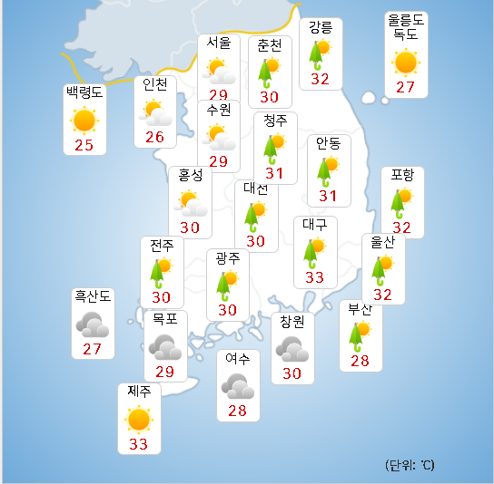▲ 제주 : [흐림, 맑음] (26∼33) <30, 10>