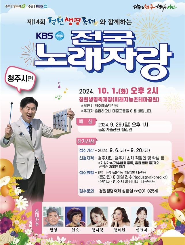통합 청주시 출범 10주년을 맞아 다음달 1일 청원구 오창읍 청원생명축제장 특설무대에서 'KBS 전국노래자랑–청주시편' 공개녹화 무대가 열린다.