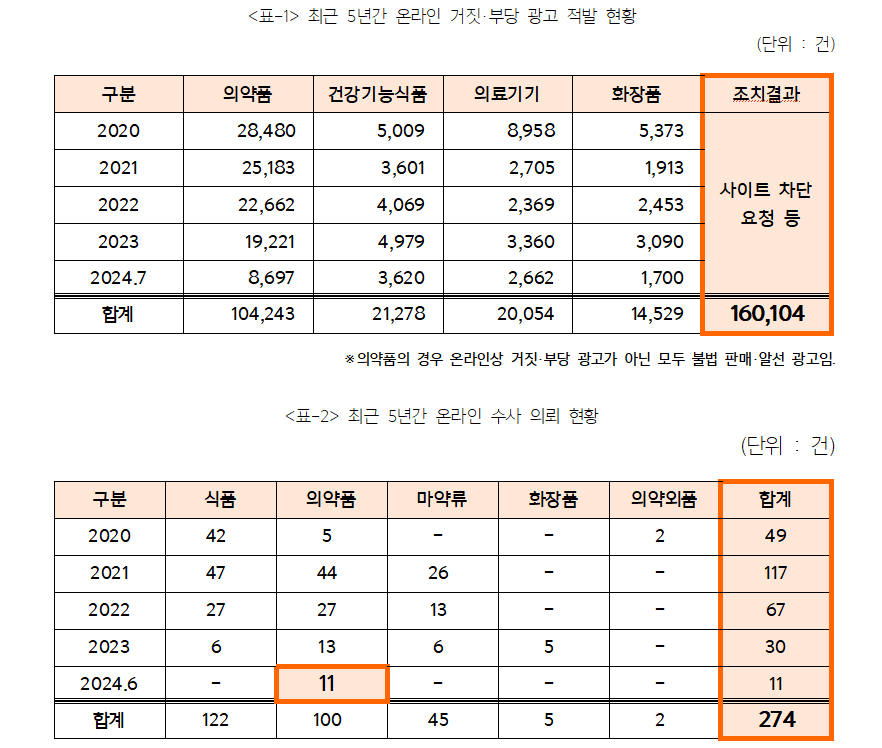 5년간 판매자가 특정돼 반복·상습 위반성이 인정된 △식품(122건) △의약품(100건) △마약류(45건) △화장품(5건) 등 274건은 경찰이 수사를 하고 있다.