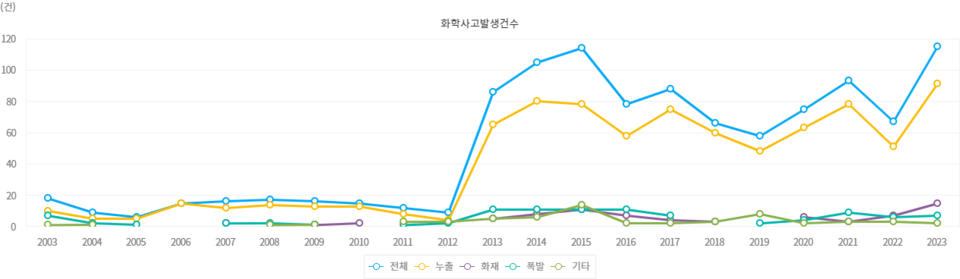 이후 화학사고는 2019년 58건에서 2021년 93건으로 급증, 지난해 115건까지 뛰었다.