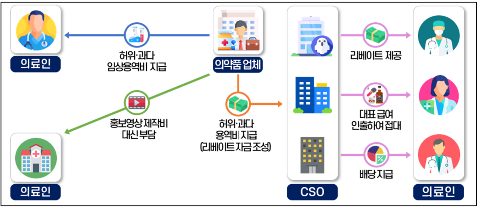 의약품 업체는 대행사에 고액의 수수료를 지급해 자금을 조성한 후 리베이트를 제공했다. 또한, 직원 가족의 명의로 위장한 대행사에 허위 용역비를 지급해 자금을 마련하고, 그 자금으로 의료인들에게 리베이트를 지급하는 등의 방법을 사용했다.