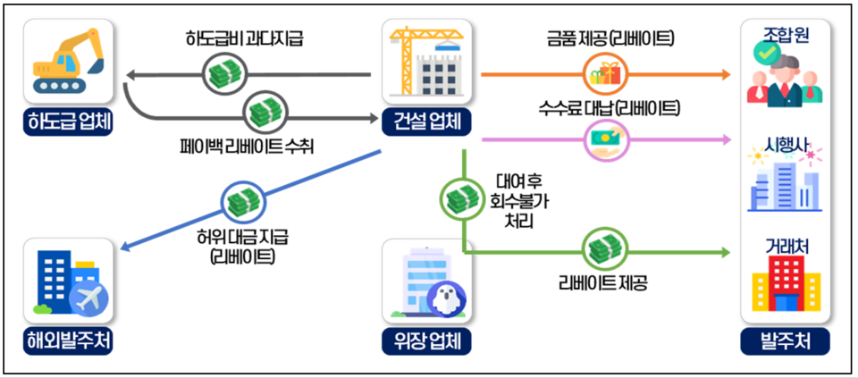 건설 분야 17곳에선 우월적 지위에 있는 시행사와 재건축조합 등 발주처의 특수관계자에게 가공급여를 지급하거나, 비용을 대신 부담하는 등 다양한 방식의 리베이트를 지급한 혐의가 적발됐다.