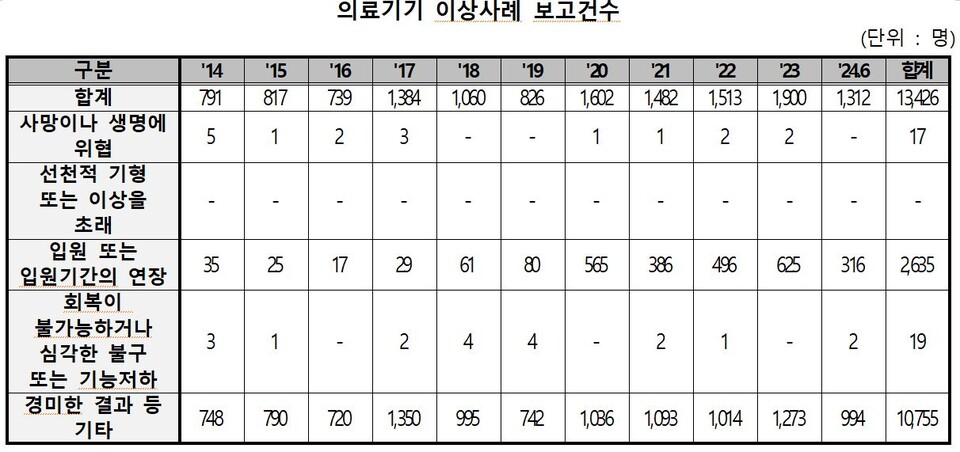 더불어민주당 박희승 의원(보건복지위·전북남원장수임실순창)이 식품의약품안전처로부터 2일 제출받은 자료를 분석한 결과, 지난 2014년부터 올해 6월까지 1만3426건의 의료기기 이상사례가 보고됐다.