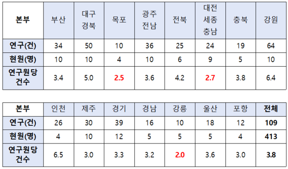 2020년부터 현재까지 5급 이상 조사연구원 1명당 조사연구 보고서는 대전세종충남본부가 2.7건이었다. 전체 평균 3.8건에 한참 못 미칠 뿐만 아니라 광역단위 가운데 최하위인 것으로 나타났다.