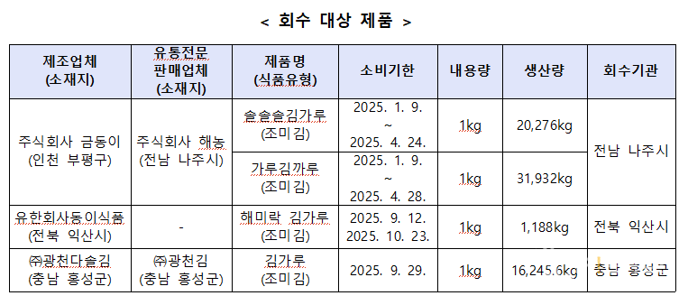 제품명은 △광천다솔김(대표 김성용) 김가루 △해농(대표 조명추) 솔솔솔김가루·가루김까루 △유한회사 동이식품(대표 최일경·김기동)이 판매하는 해미락김가루입니다.