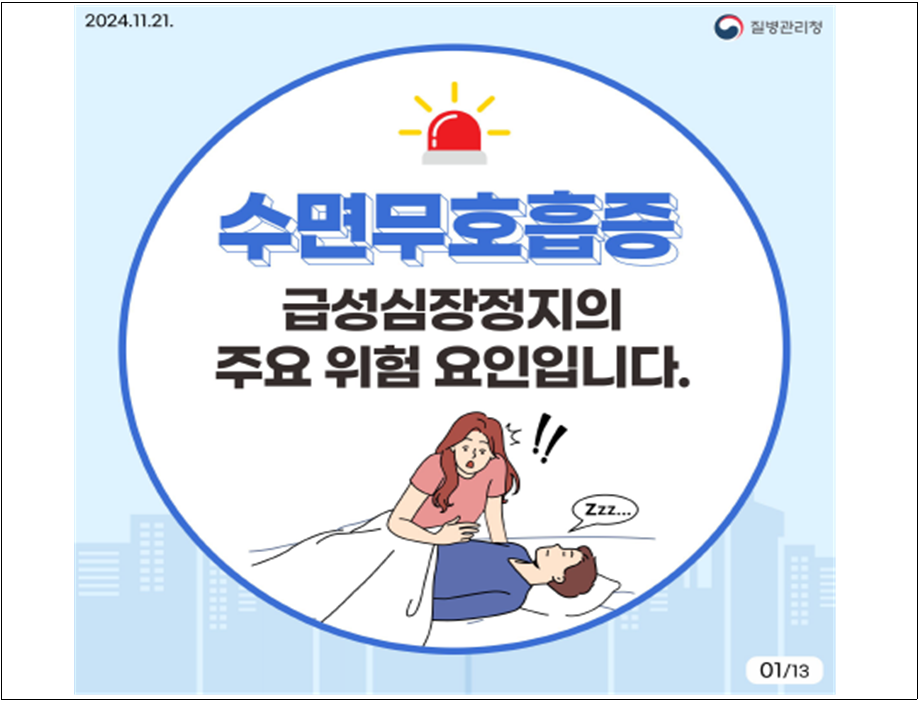 질병청은 수면무호흡증의 △증상 △급성심장정지 위험성 △자가진단법 △치료방법 등에 대한 정보를 담은 카드뉴스를 제작·배포한다. 국가손상정보포털과 질병청 홈페이지에서 확인할 수 있다.