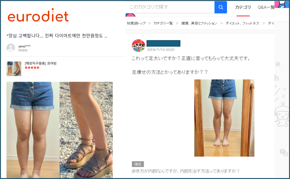 이미지를 추적한 결과 일본 야후 사이트 건강·미용 다이어트 카테고리에 '발이 굵은 것 같아 고민'이라는 내용으로 업로드된 것을 쉽게 확인할 수 있었다.