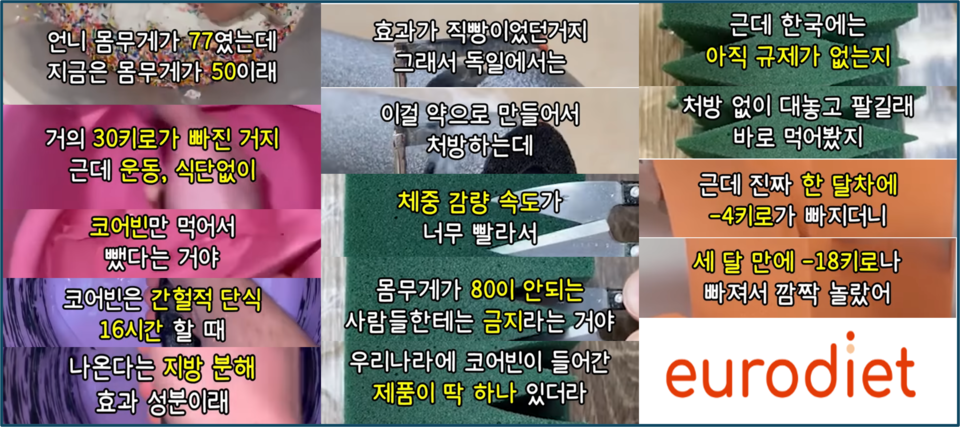 유로디에트는 전후 사진을 활용해 극적인 변화를 보여주고 있다. 날씬한 몸매를 가진 소비자들이 △운동 안 해도 △먹을 거 다 먹으면서 △너무 빨리 빠진다 등을 언급하는 리뷰가 높은 비율을 차지하고 있다.
