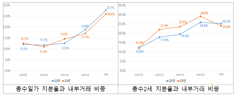 특히 총수 2세 지분율 50% 이상 구간 계열회사의 국내계열사 간 내부거래 비중은 29%, 2022년과 비교해 3.2% 증가했다.