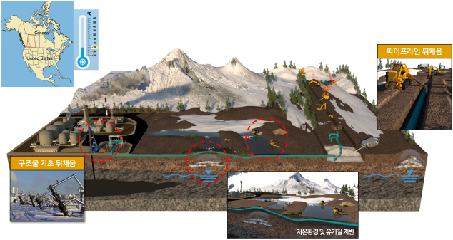 오일샌드 매장지역은 동결·융해에 민감한 유기질토가 많이 분포해 겨울철 지표면이 융기되고 침하량이 일반지반보다 크다.