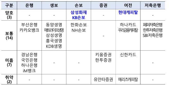 금감원이 우수를 부여한 금융사는 한 곳도 없었다. 삼성화재·KB손해보험·현대캐피탈 등 3개사에겐 소비자 의견을 적극 반영하고 민원 모니터링 체계를 구축했다며 양호를 부여했다.