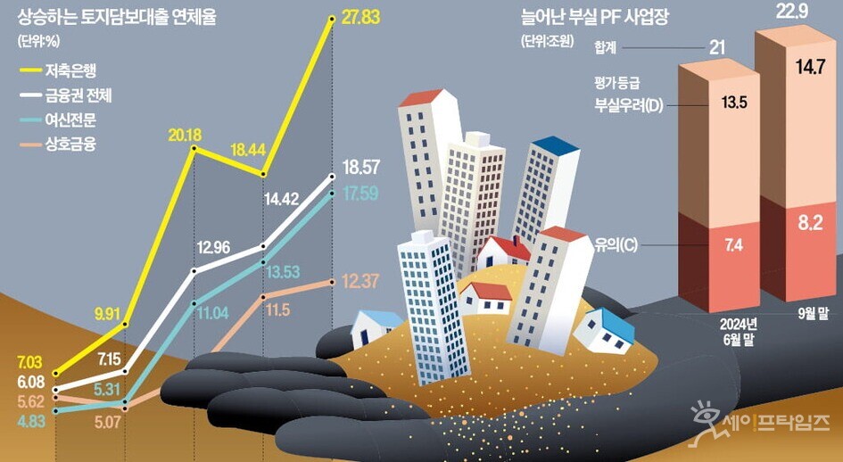 C·D등급 여신을 PF 유형별로 보면 토지담보대출이 13조5000억원으로 가장 많으며 브리지론(4조8000억원)과 본PF(4조5000억원)가 뒤를 이었다.