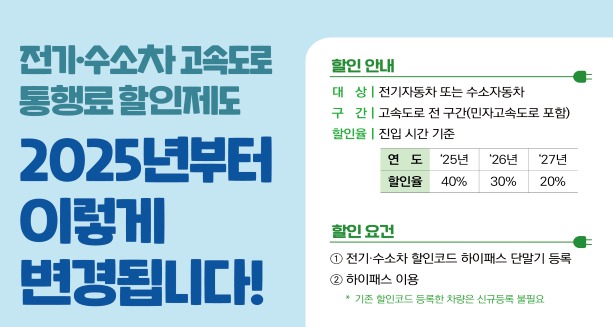 한국도로공사 관계자는 "전기·수소차 할인제도가 변경됨에 따라 이용 방법을 확인하시고 불편함이 없길 바란다"고 말했다.