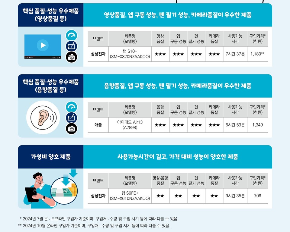 한국소비자원이 △삼성 갤럭시탭 S10+ △갤럭시탭 S9 FE+ △애플 아이패드 Air13 △레노버 P12 등 4개 태블릿PC의 제품 평가 결과 성능 차이를 확인했다고 4일 밝혔다.