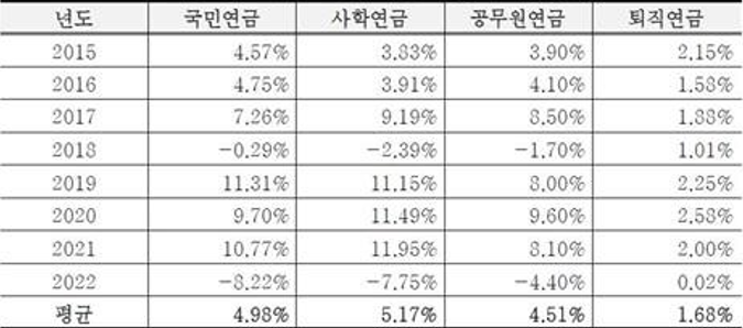 국민·공무원·사학연금 등은 2015년부터 8년간 5% 가량의 연평균 수익률을 기록하기도 했다.