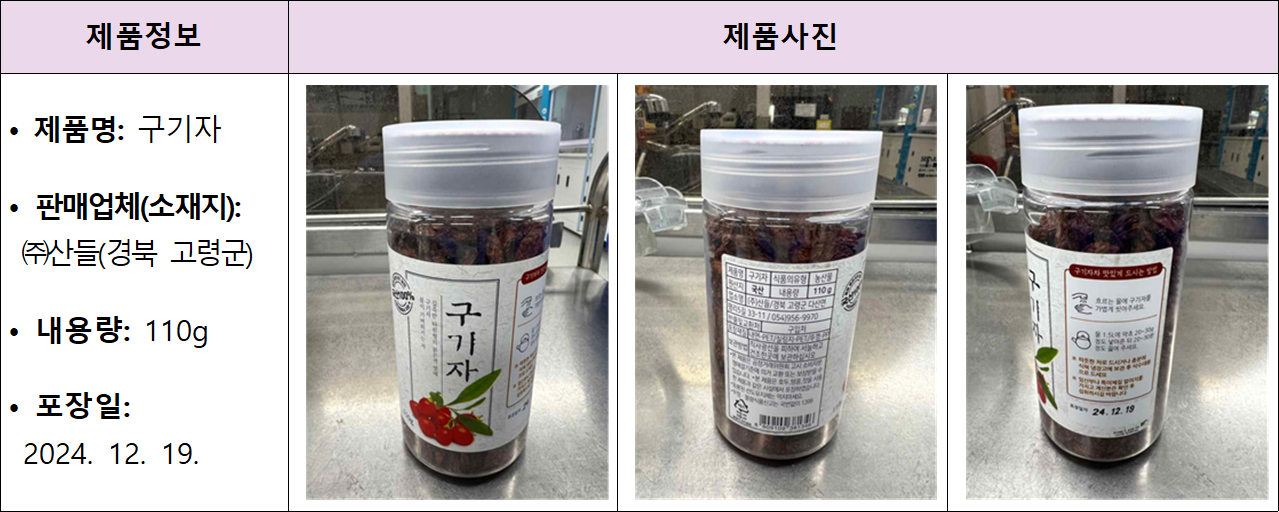 식품의약품안전처는 경북 고령군 업체 '산들'이 포장·판매한 국내산 구기자에서 잔류농약이 기준치보다 초과 검출돼 해당 제품을 판매 중단하고 회수 조치했다고 14일 밝혔다.