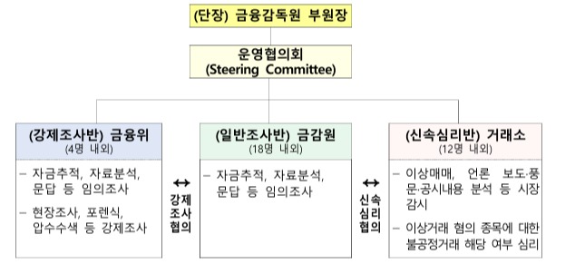 합동대응단은 조직들에 분산된 권한을 모아 대주주·경영진이나 SNS·허위보도 악용 사건 등 긴급·중요사건을 초기부터 공동 조사할 방침이다.