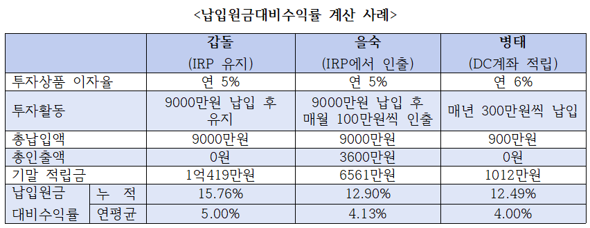 예를 들어보자. 갑돌이는 퇴직 후 9000만원을 IRP 계좌에 입금해 연 5%의 확정금리를 주는 상품에 가입했다. 3년 후 그의 적립금은 약 1억419만원, 납입원금기준 누적수익률은 15.76%다.
