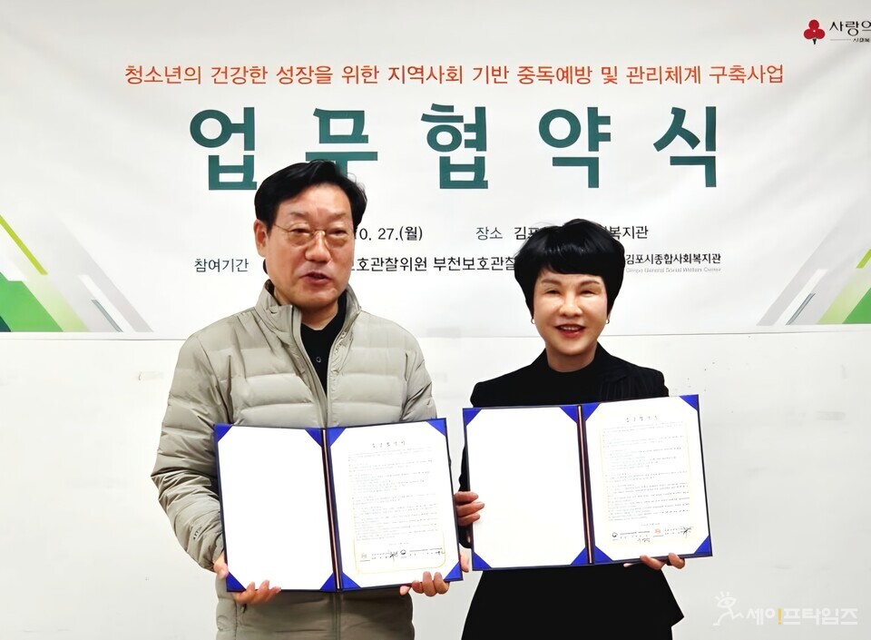 법무부 부천보호관찰소협의회 김포지구협의회(회장 우영선)와 김포시종합사회복지관(관장 최유호)은 27일 김포시종합사회복지관에서 지역사회 내 청소년 보호와 복지증진, 중독예방 등 다양한 협력활동을 지원하고 상호 이익을 증진시키기로 하는 업무 협약(MOU)을 맺었다.