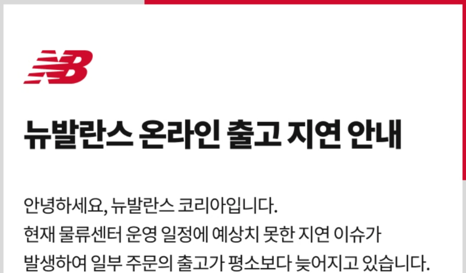 이랜드월드가 국내에 유통하는 뉴발란스는 "현재 물류센터 운영 일정에 예상하지 못한 지연 이슈가 발생해 일부 주문의 출고가 늦어지고 있다"며 "상품은 순차적으로 출고를 준비하고 있다"고 공지했다.
