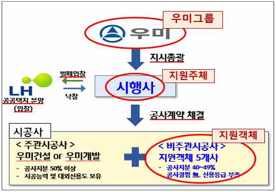 한국토지주택공사(LH)는 '벌떼입찰'을 근절하기 위해 1순위 입찰 요건을 주택건설실적 300세대로 강화했다. 이에 우미그룹은 기존에 입찰에 활용하던 계열사들을 계속 참여시킬 목적으로 지원행위를 기획·추진했다.