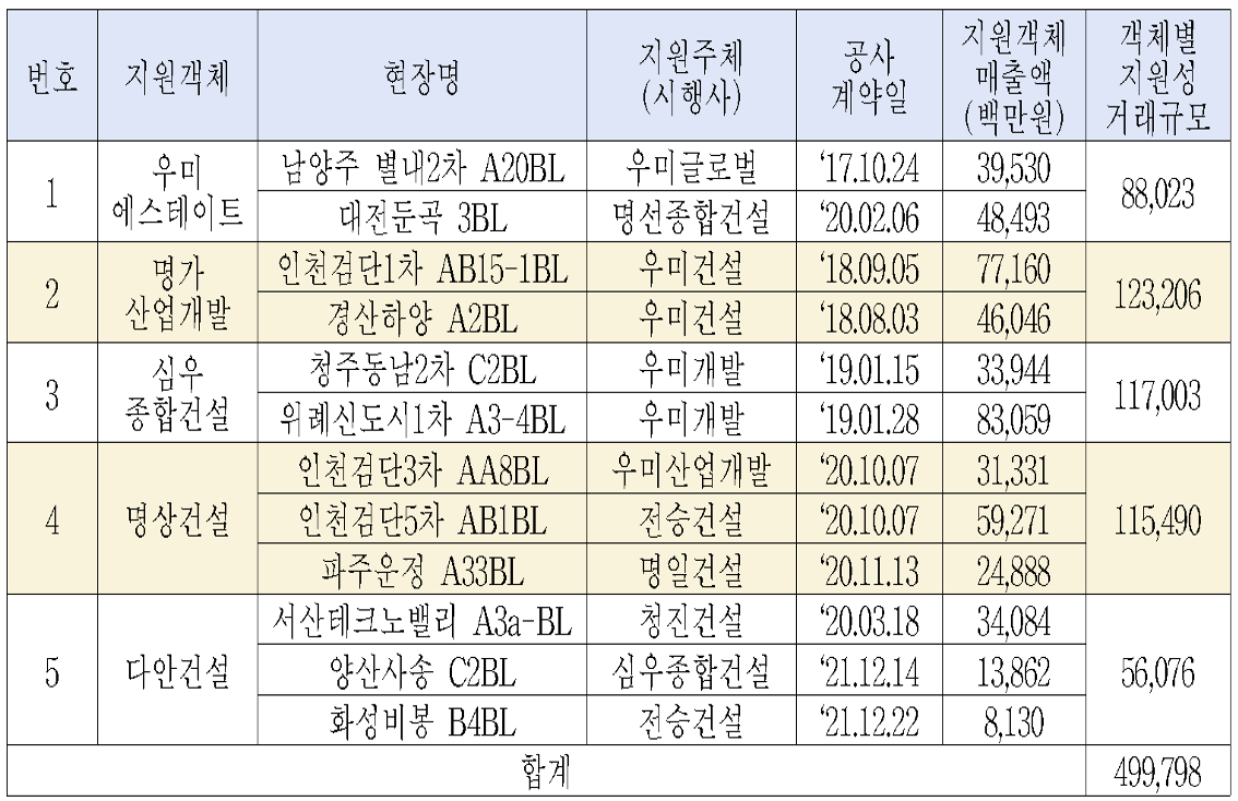 이들은 2017년부터 자신들이 시행하는 12개 아파트 공사 현장에 주택건설 실적이 없는 지원 객체들을 비주관 시공사로 선정해 4997억원에 달하는 공사 물량을 제공했다.