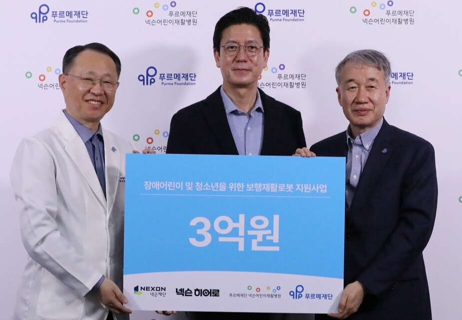 넥슨은 푸르메재단 넥슨어린이재활병원에 장애 로봇재활치료 확대를 위한 운영기금 3억원을 전달했다고 24일 밝혔다.