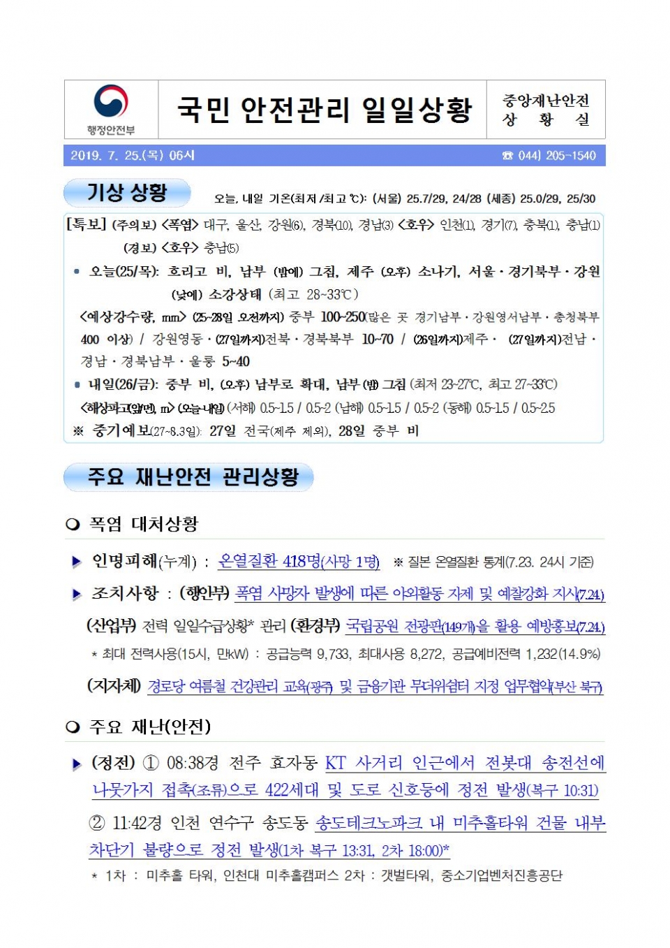 - [7월 24일 안전상황실] 변압기 과부하 1232세대 정전