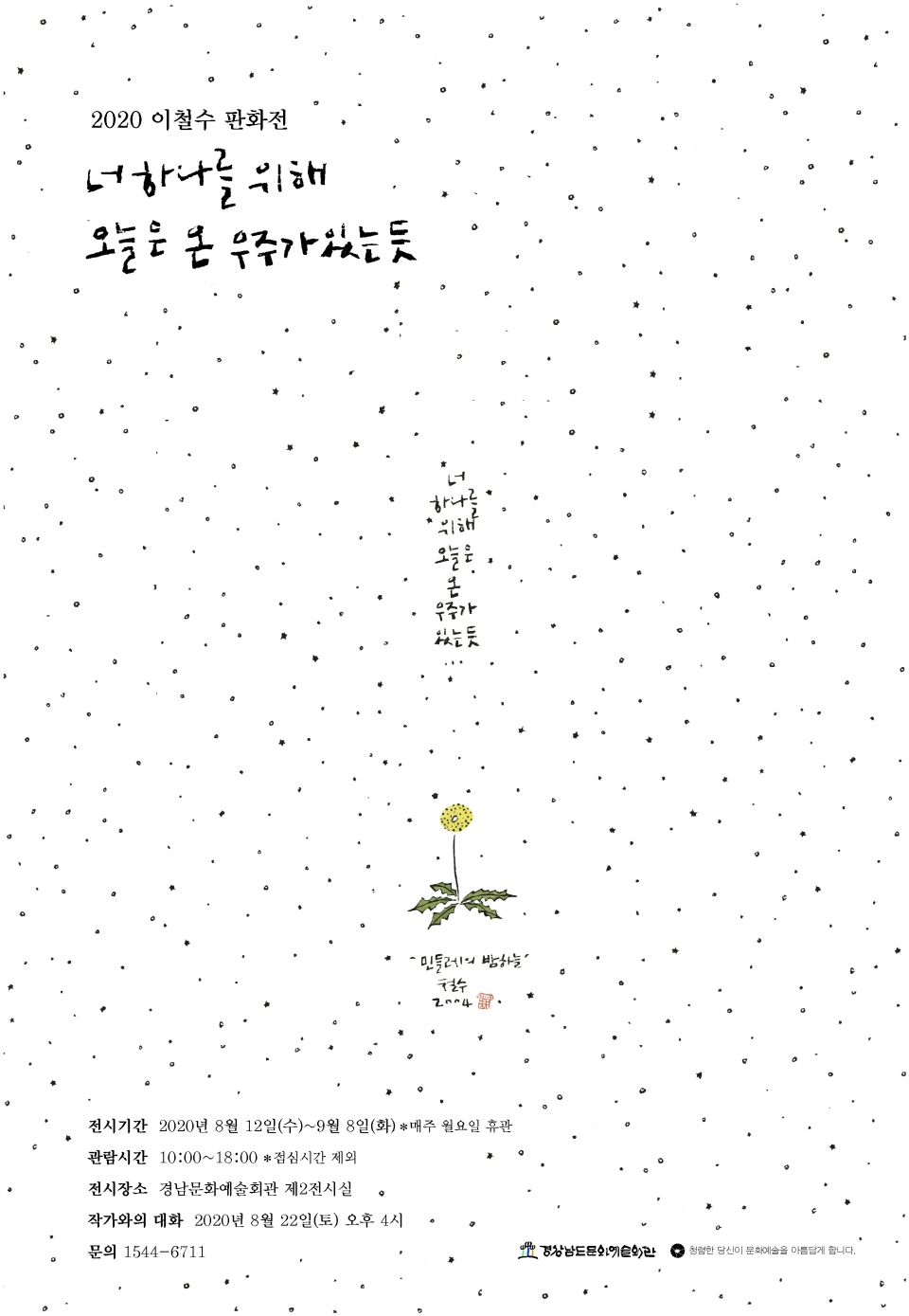 경남문화예술회관은 오는 12일부터 다음달 8일까지 제2전시실에서 '2020 이철수 판화전–너 하나를 위해 오늘은 온 우주가 있는 듯' 전시를 연다.