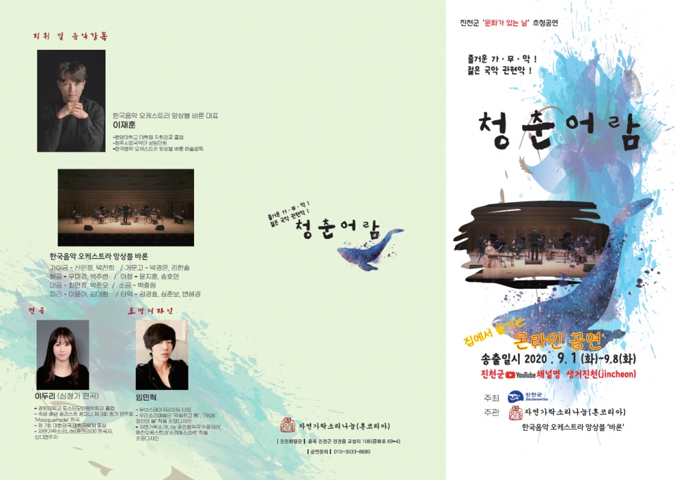 충북 진천군은 기획 국악 공연인 '청춘어람'을 다음달 1~8일 군 공식 유튜브채널을 통해 공개한다. 공연은 실내 위주 생활을 이어가고 있는 지역 주민들을 위해 온라인으로 제공한다.