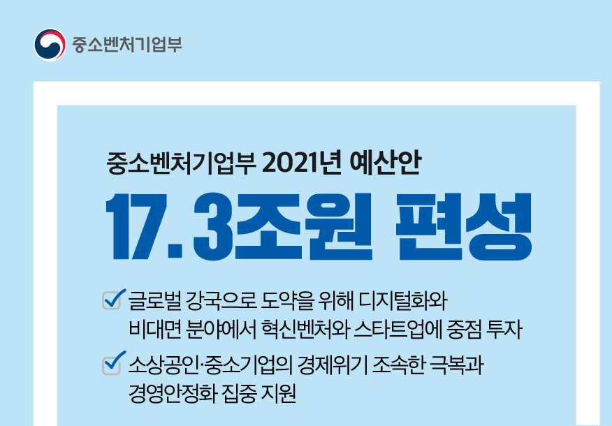 중소벤처기업부는 2021년 예산안을 올해보다 3조9853억원 증가한 17조3493억원으로 편성해 국회에 제출할 예정이라고 2일 밝혔다.